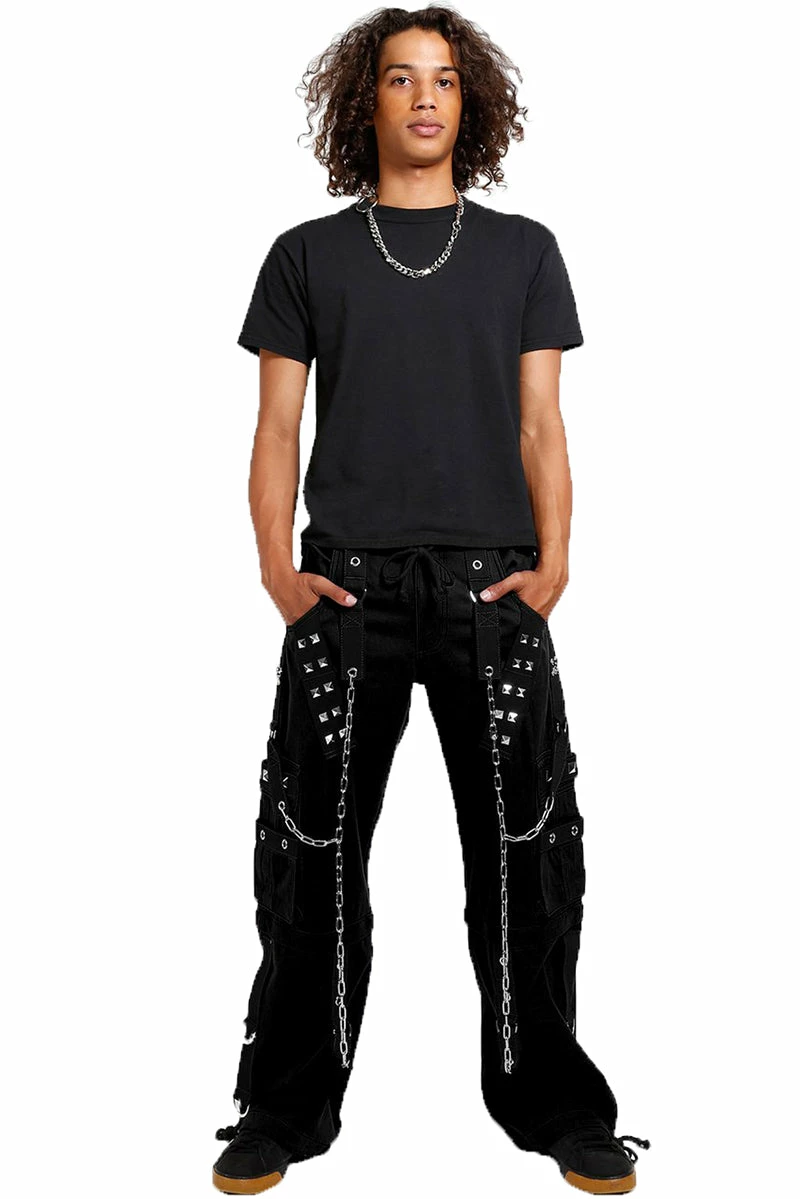 You own the Underworld in these baddie street goth pants! Black and baggy, these statement Tripp pants feature removable chains, pyramid studs, and metal eyelets. Keep it comfy in the adjustable drawstring waist and ankles; zip off the pant legs to transform these pants into shorts! Finished with deep pockets—perfect for carrying your wallet, phone, smokes, and tears of your enemies.Â