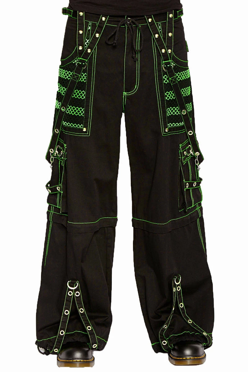 Summon electric feelz in these rad raver pants! Release hell in the bright green accents, silver eyelets, and metal D-ring hardware. Carry your smokes and wallet in the deep netted pockets—rock or remove the statement chains! Features adjustable ankles and a drawstring waist for the perfect fit. Zip off the pants legs to transform these Tripp pants into shorts!Â