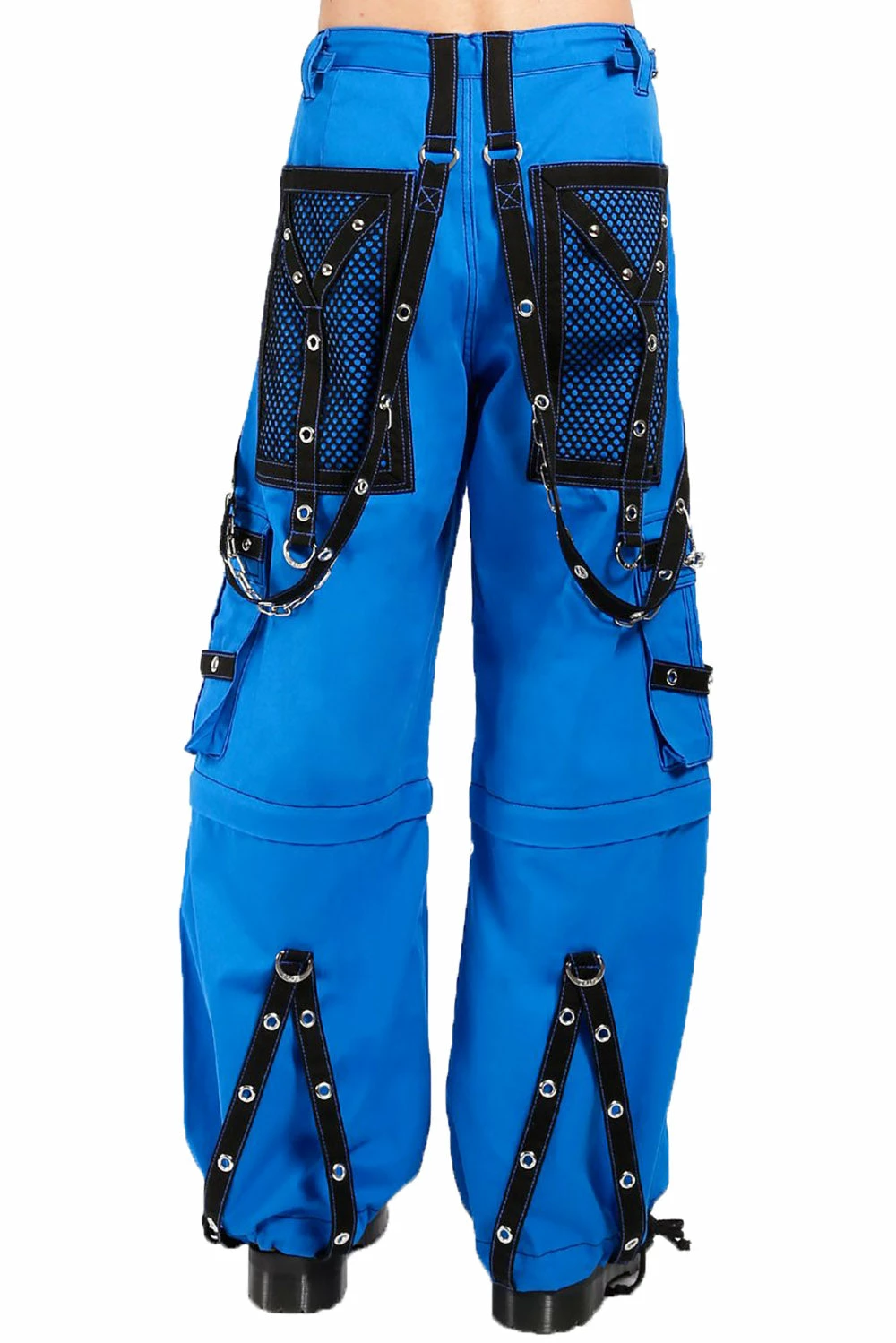 Own the city streets in these baggy bondage pants, hexed with a royal blue and black colorway. Customize your afterlife in the removable chains, adjustable ankles, and drawstring waist. Features metal d-rings and eyelet hardware. Carry your smokes and wallet in the deep netted pockets + cargo pockets. Finished with zip-off legs so you can transform these Tripp pants into shorts!Â
