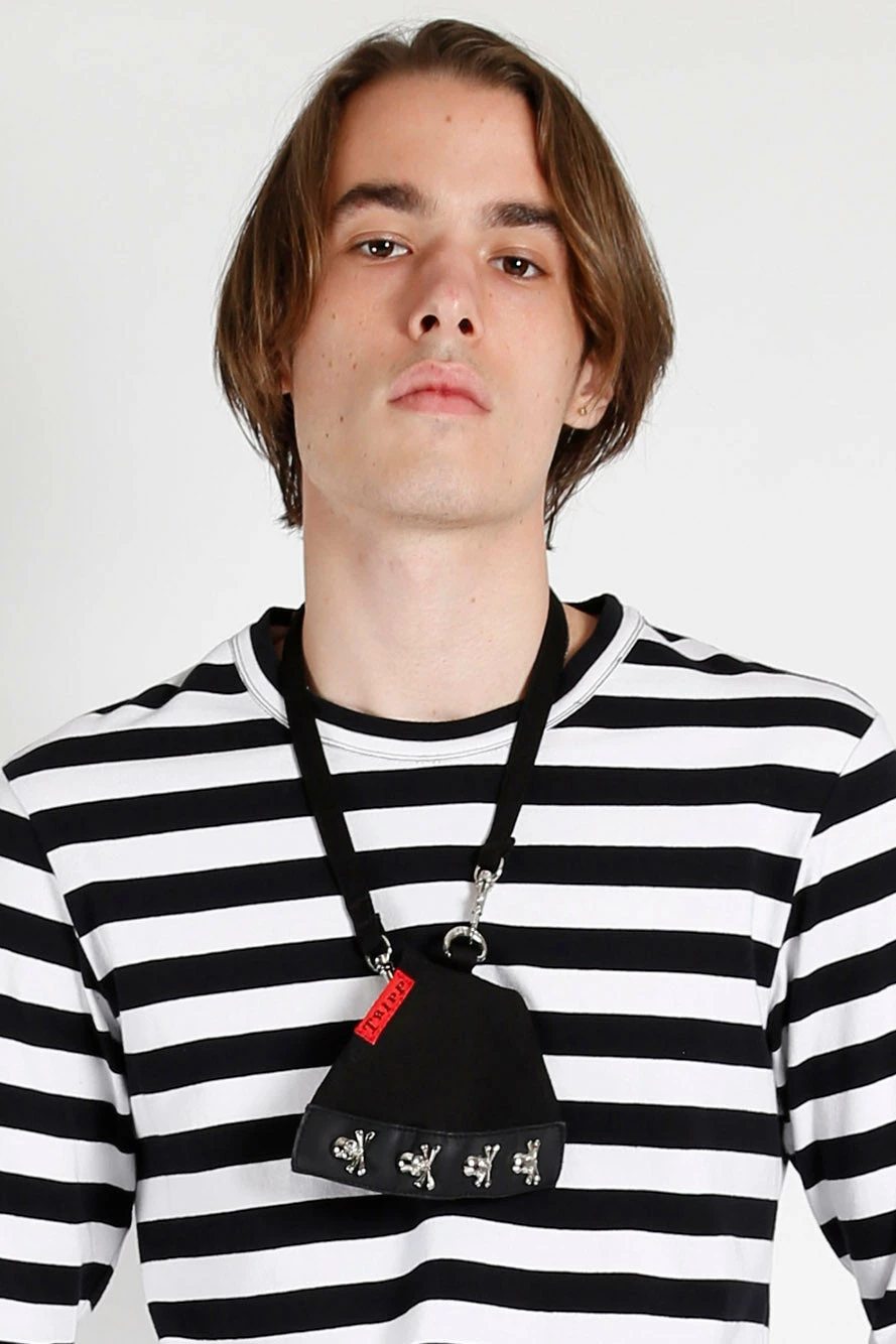 Haunt the streets in this bondage face mask, loaded with a statement strip down the front + metal accent skulls. This mask is made of the same dope material as Tripp pants. Hang the detachable strap around your neck for easy on-and-off removal, so you never lose your mask again! Take that, Covid.Â