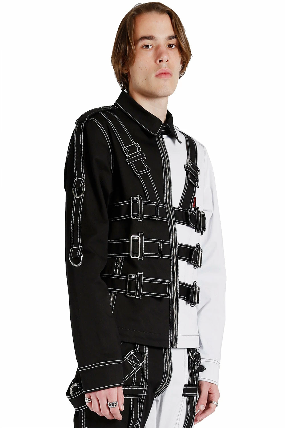 You keep it criminally cool in this rad rave jacket, complete with accent straps and buckles all over. Half black and half white, this goth jacket is constructed to flatter your figure with its trim + tailored design. Zip it up all the way or show some skin—the choice is yours!