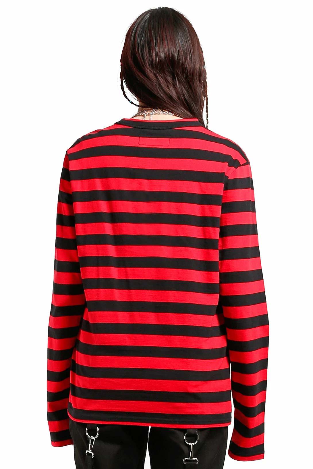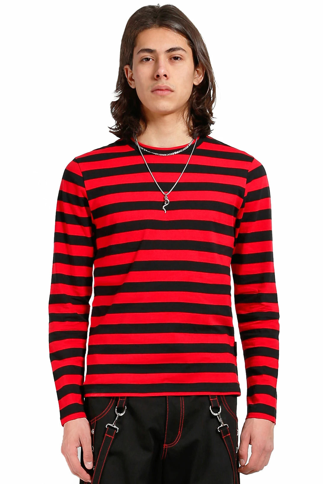 Invoke some emo with this signature striped shirt—an essential in every goth boy and ghoul’s closet! Made of high-quality cotton, this long sleeve tee features black and blood red stripes, a flattering fit, and super soft construct. Layer it under a band shirt, or rock it on its own… whatever your dark heart desires!