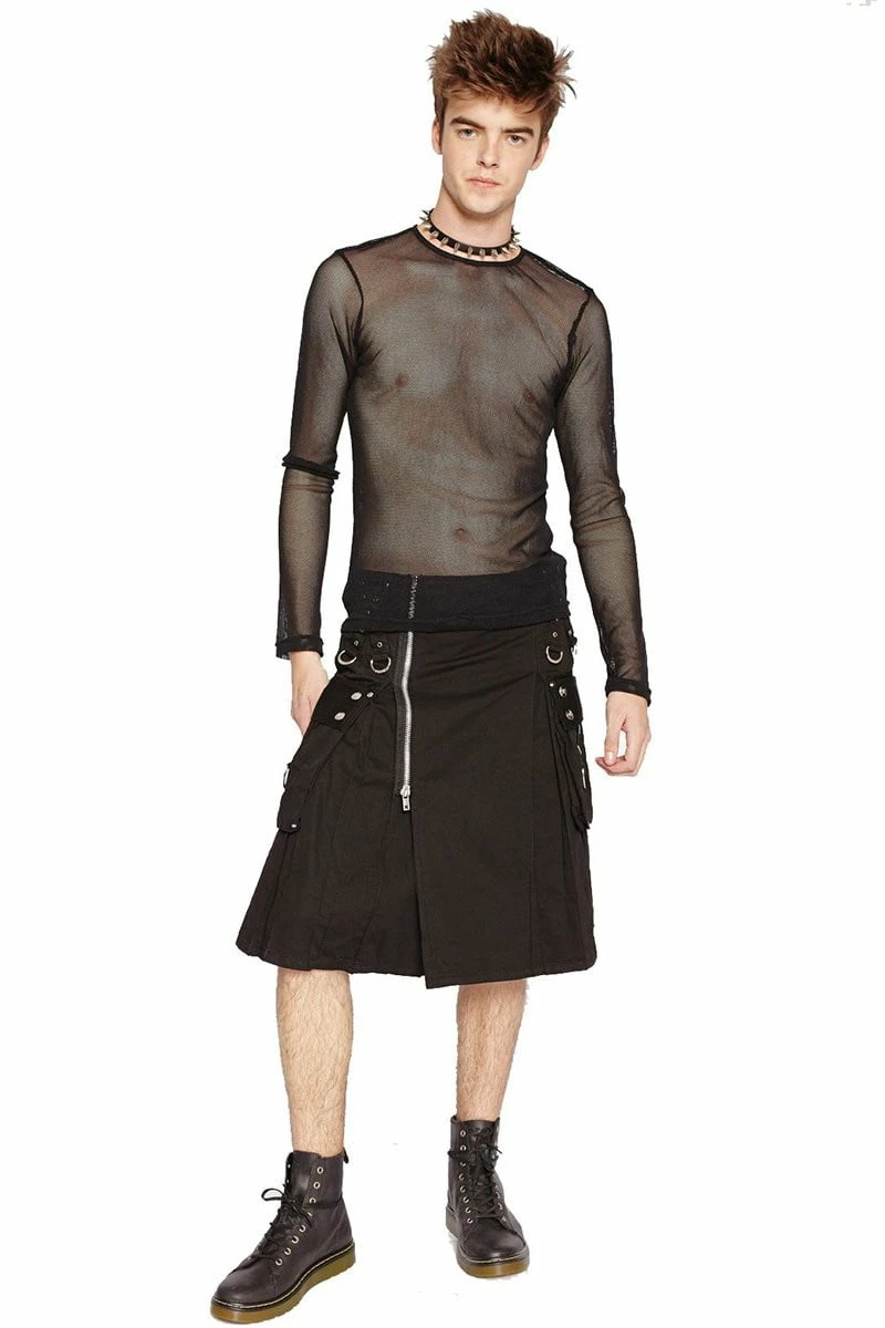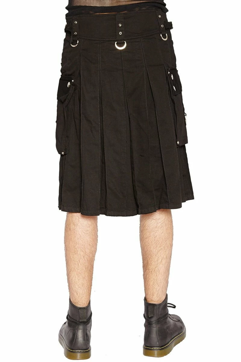 Made for the man on the move, this killer kilt honors the traditional Scottish skirt… possessed with punk rock! Harness your inner heathen with the easy front-zipper entry, large cargo pockets, and x-strap accents on the front. Pull strength from the shadows with the hardware details—metal rivets, grommets, skull buttons, and D-ring details all over.