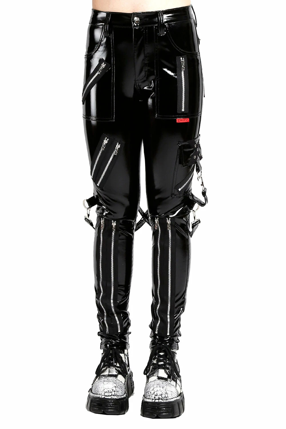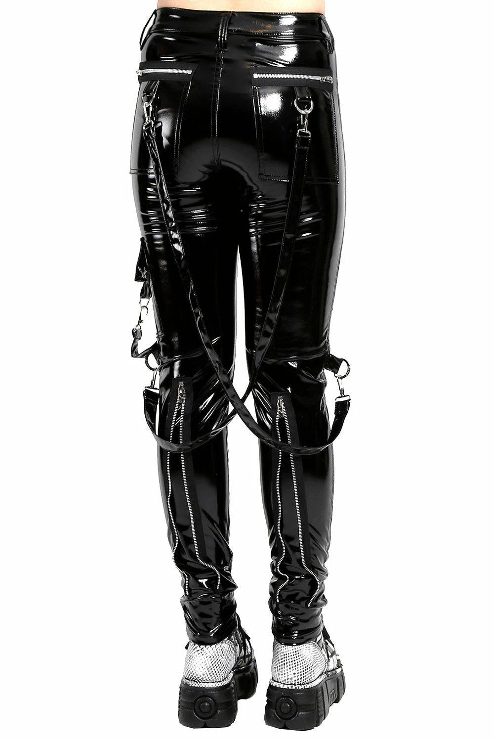 You rage all day and rave all night in these sexy + shiny pants. Pure rock n’ roll, these high-gloss vinyl pants are designed to drop jaws and turn heads. Made of premium PVC, these sikk skinny jeans are hella hott with a wet-black look, bondage straps, and exposed zipper details.Â