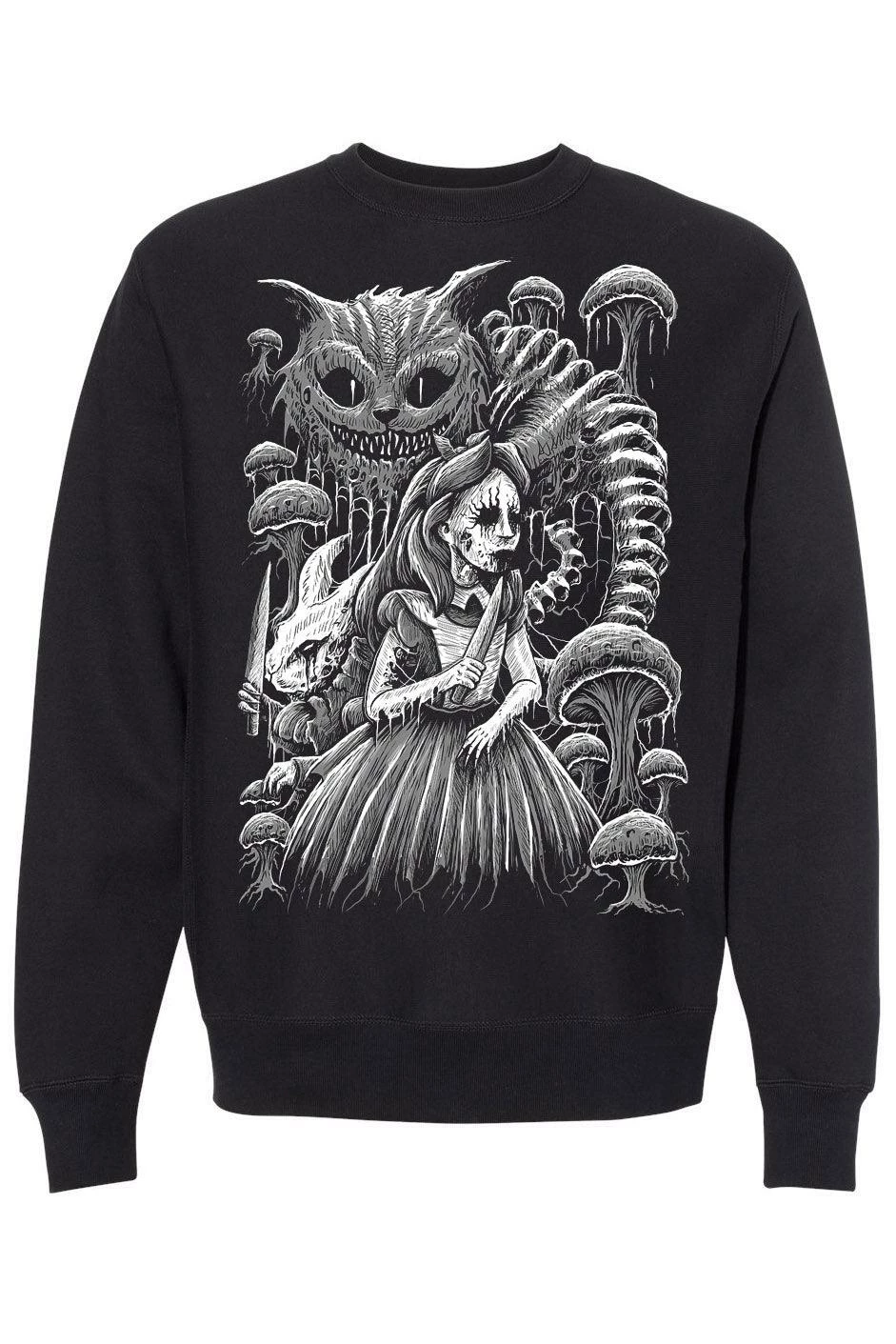 Murder your way into Wonderland in this sickening sweatshirt! Fall down the rabbit hole in the heavy metal design, featuring Alice and the White Rabbit haunting Wonderland with knives in hand. The Cheshire Cat lurks above them—his striped tail composed of spinal bones. Sinfully soft to please your wickedly whimsical heart.Â