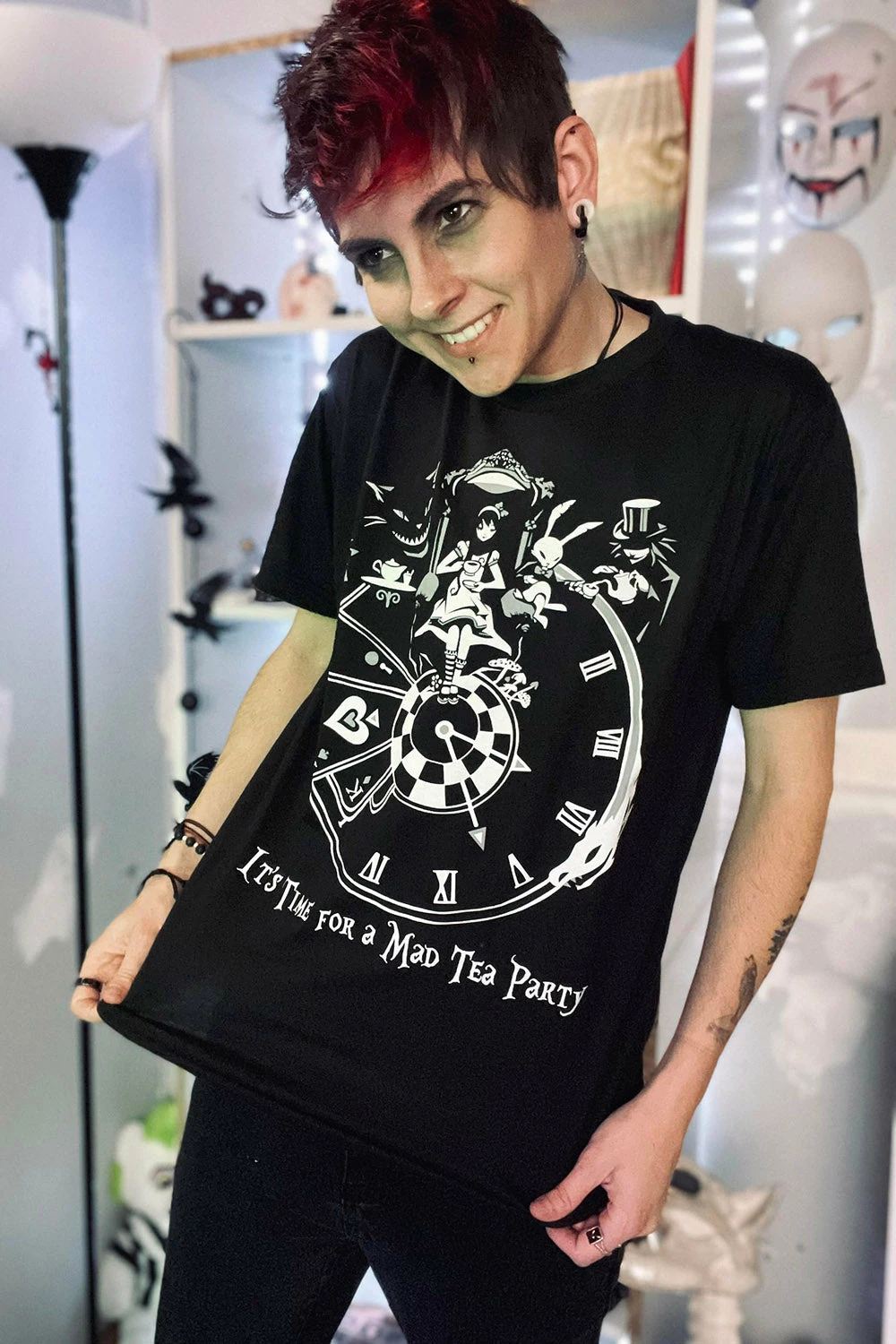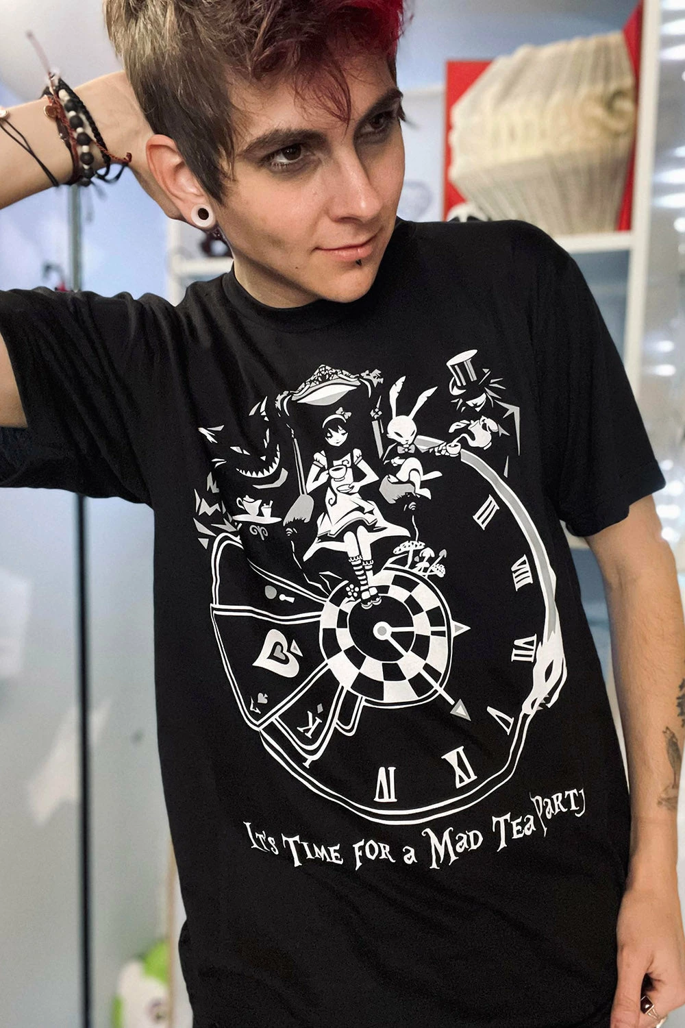 Wear your chronic tardiness like a badge of honor with VampireFreaks’ Alice in Wonderland Clock Tee! Designed by the curious creatures at VF, Alice sips tea atop a ticking clock, accomplished by her cuckoo companions—the Cheshire Cat, the White Rabbit, and the Mad Hatter!Â