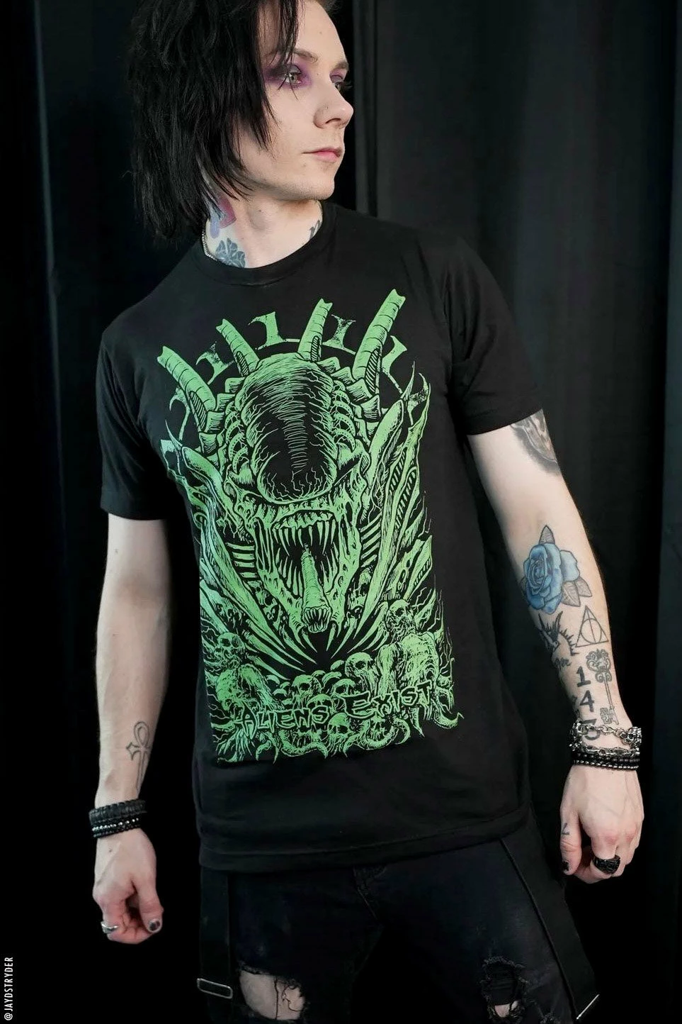 Show human meat sacks aliens exist in this extraterrestrial tee! Petrify onlookers with the shocking green design, featuring an alien about to devour its human prey. Keep invaders from outer space at bay with the Aliens Exist lettering, haunting a grave of webbed skulls and tentacles. Complete with VampireFreaks branding on the back.