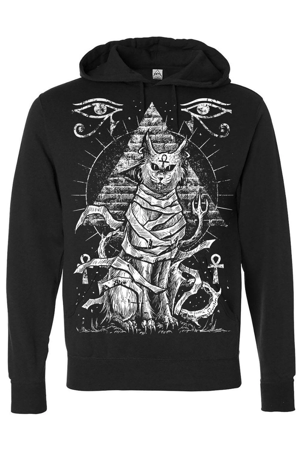Invoke the Egyptian gods of old wearing this occult Bastet hoodie! Let the goth goddess of secrets, home, and creepy cats protect your path in the heavy metal design, featuring Bastet bound in mummy wrappings. A pyramid looms in the background—Ankh symbols and ancient eyes haunt the night sky to guide you through the darkness. Handprinted on a high-quality, killer cozy hoodie.Â