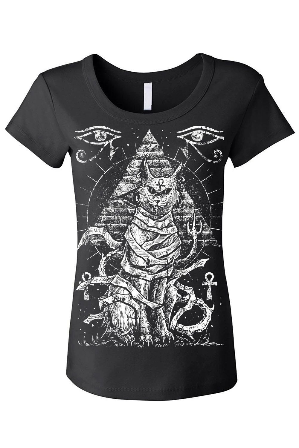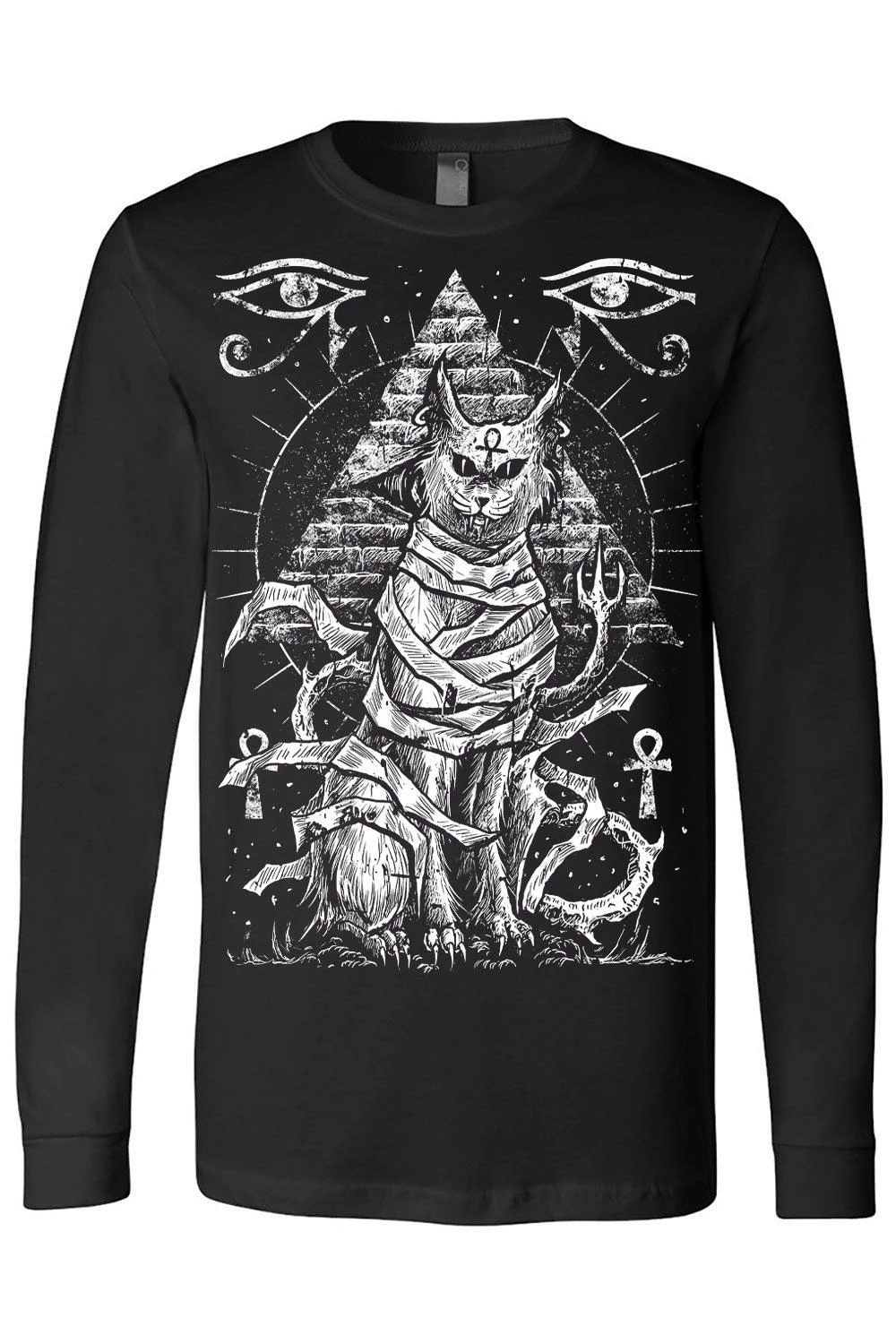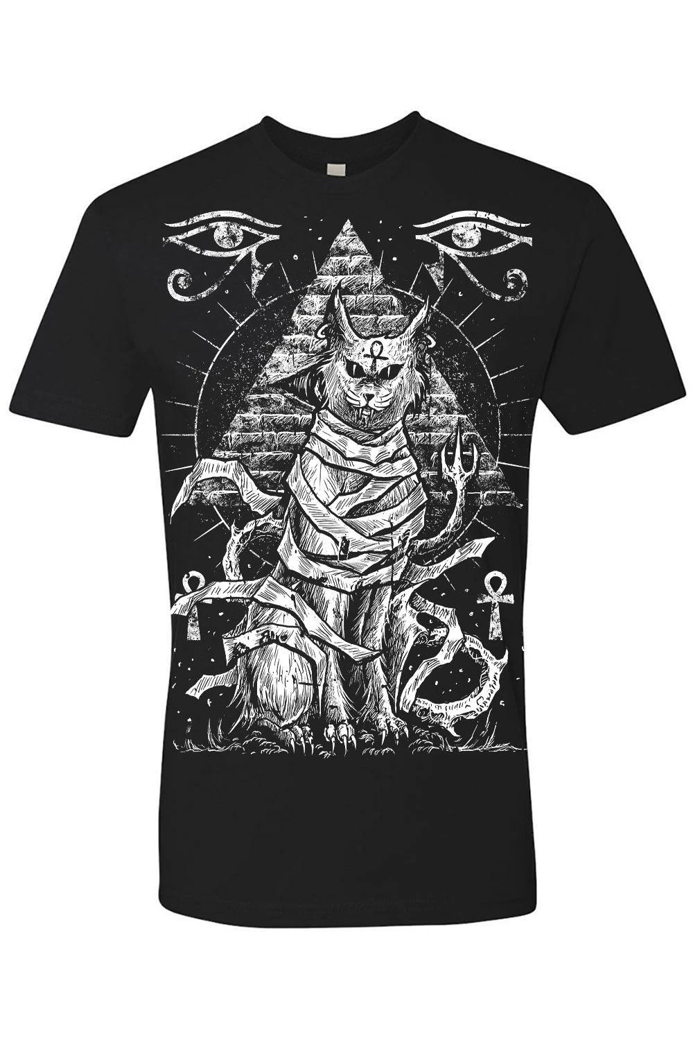 Invoke the Egyptian gods of old wearing this occult Bastet tee! Let the goth goddess of secrets, home, and creepy cats protect your path in the heavy metal design, featuring Bastet bound in mummy wrappings. A pyramid looms in the background—Ankh symbols and ancient eyes haunt the night sky to guide you through the darkness. Handprinted on high-quality, killer cozy tees.Â