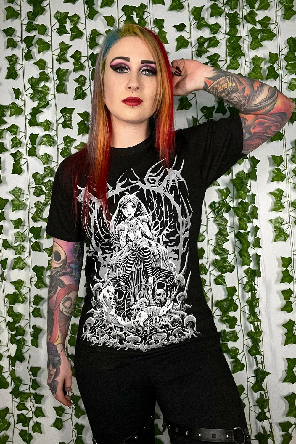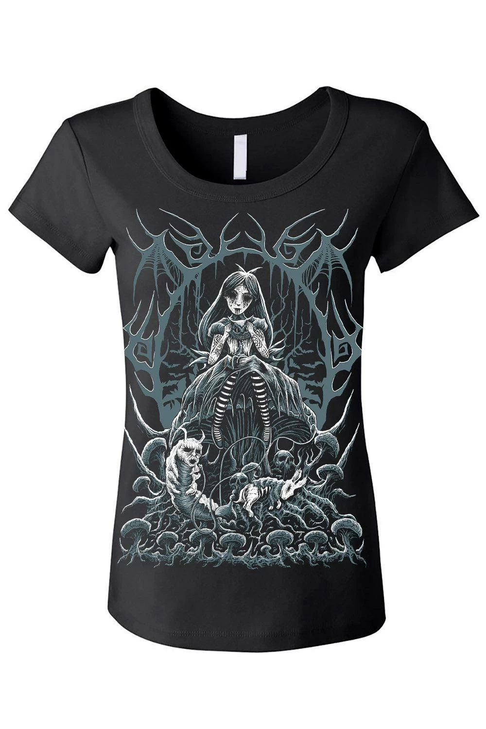 In this exclusive VampireFreaks design, Alice sits atop a morbidly magical mushroom, swinging her stripy stockings above a gory garden of skulls, rancid roots, and a cadaverous caterpillar. Stroking the decapitated head of the Cheshire Cat, the dearly departed pussycat’s entrails leak into Alice’s lap. Enveloped in a cameo of vines, bats, and severed wings, Alice watches over Wonderland with her black, soulless eyes.  Â