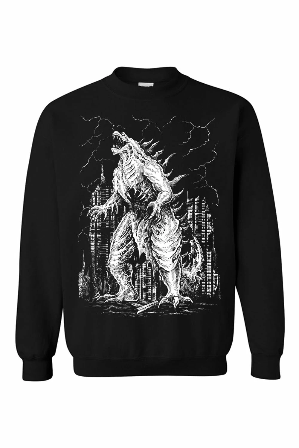 Unleash your inner beast in this hella hardcore Gothzilla sweatshirt! Haunt the streets with the heavy metal design, featuring the king of the monsters wrecking revenge on a demolished city. Lightning strikes the pitch-black sky as Gothzilla screams into the toxic air. Razor-sharp claws and talons jet from his body, as a vacuous hole surrounded by spikes consumes everything in the monster’s wake. Perfect for horror addicts and those more monster than man.