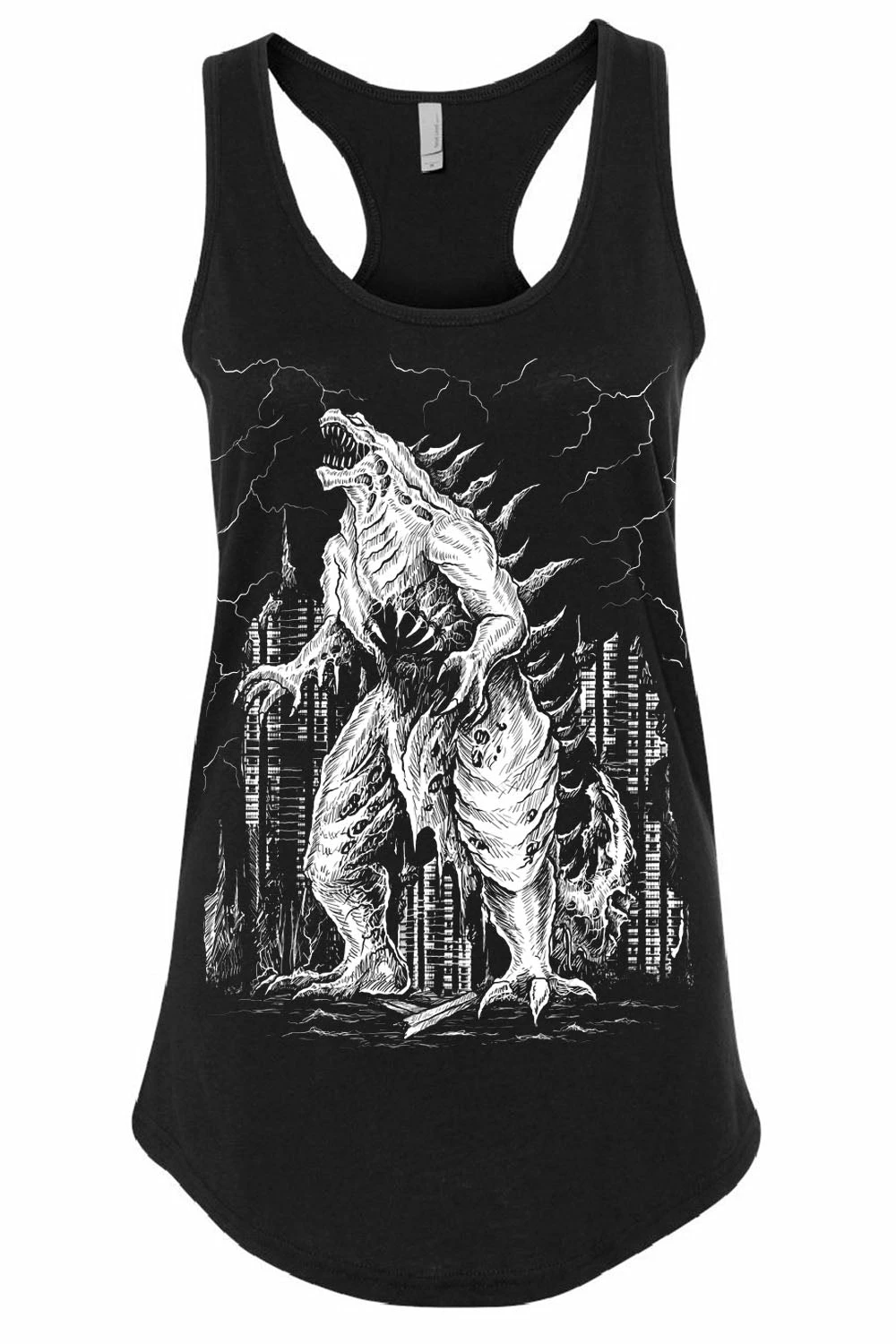 Unleash your inner beast in this hella hardcore Gothzilla tee! Haunt the streets with the heavy metal design, featuring the king of the monsters wrecking revenge on a demolished city. Lightning strikes the pitch-black sky as Gothzilla screams into the toxic air. Razor-sharp claws and talons jet from his body, as a vacuous hole surrounded by spikes consumes everything in the monster’s wake. Perfect for horror addicts and those more monster than man.