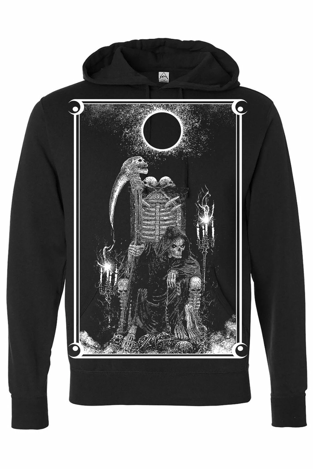 Pay homage to the harbinger of death in this haunting hoodie! The Grim Reaper sits on a throne of human bone, ruling over his domain of the damned. Candles flicker on the Reaper’s scythe, made from the remains of his prisoners. A black moon rises above in the forever-night sky… for in the underworld, darkness reigns. Â