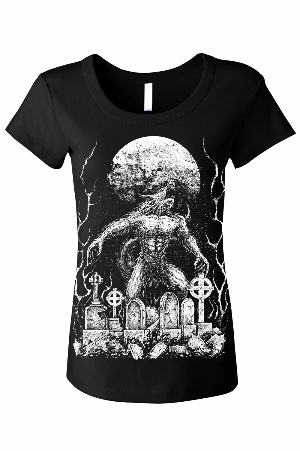 Bark at the moon in this wicked werewolf tee! Bare your fangs at the world in the cozy cotton construct, sinfully soft and comfy. Features a ferocious wolfman stalking a cemetery of crumbling graves. A full moon rises in the night sky—distressed moon phases haunt the long tee sleeves. Perfect for Lycans, night walkers, and those who dwell in shadow.