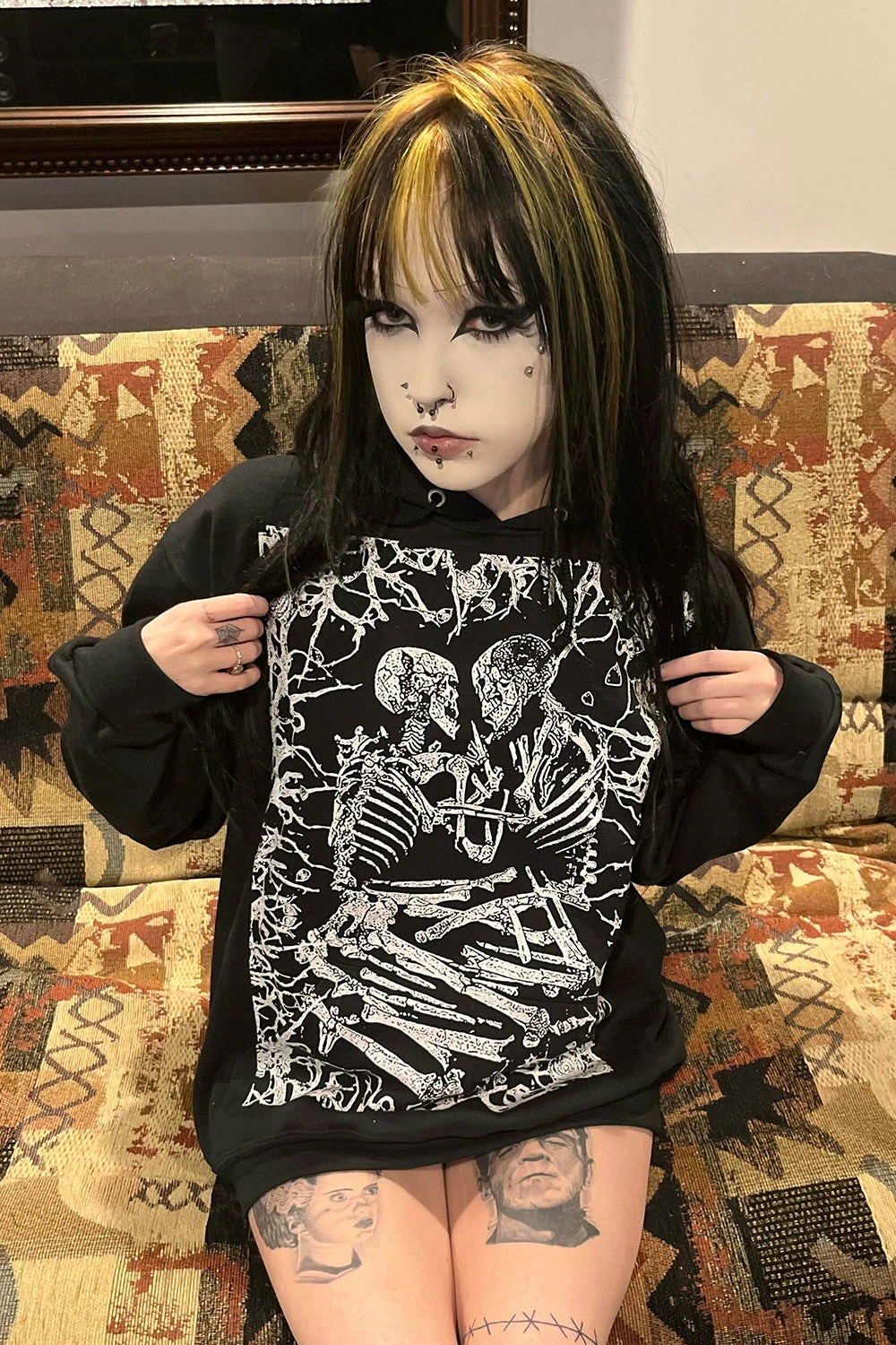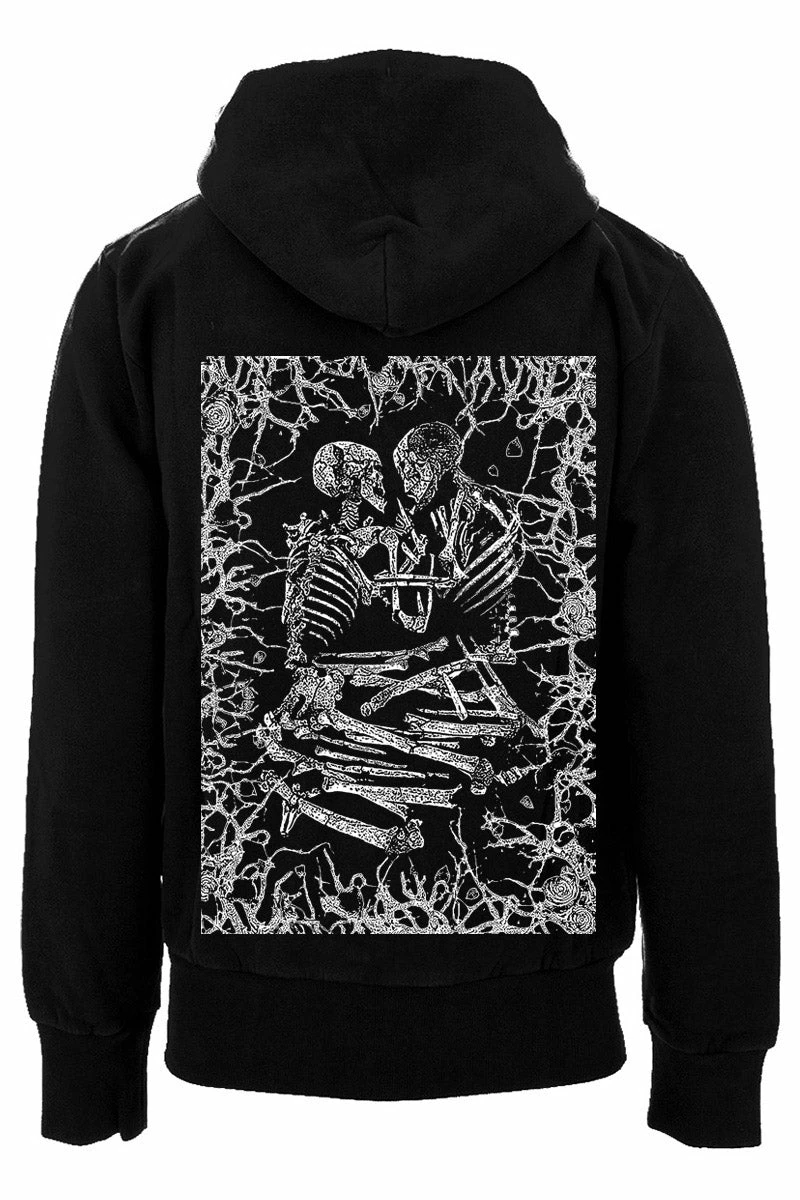 Never let love die in this haunting hoodie, featuring two skeleton lovers lying in a forgotten tomb overgrown with thorns & roses. Stay cozy and creepy in the soft cotton construct, designed to bring some gothic romance to your goth clothes. Featuring the Valdarro Lovers—a pair of human skeletons over 6,000 years old who died in death’s eternal embrace. Â