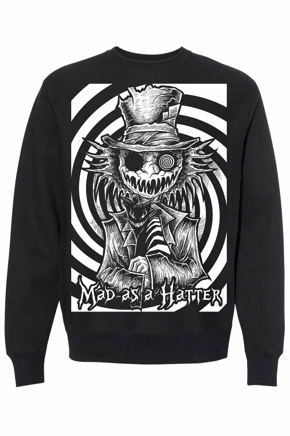 Fall down the rabbit hole in this wickedly whimsical sweatshirt! Slip into madness in the hella chilling design, featuring the Mad Hatter holding his peculiar pet…. The Cheshire Cat! A distressed top hat sits on the Hatter’s shock of hair. With a strange sharp smile, he watches over Wonderland with one spiral and one cavernous black eye. Mad as a Hatter lettering haunts the swirly background to help you slip into insanity. The perfect sweatshirt for mad men, creepy cat parents, and fans of Alice in Wonderland!