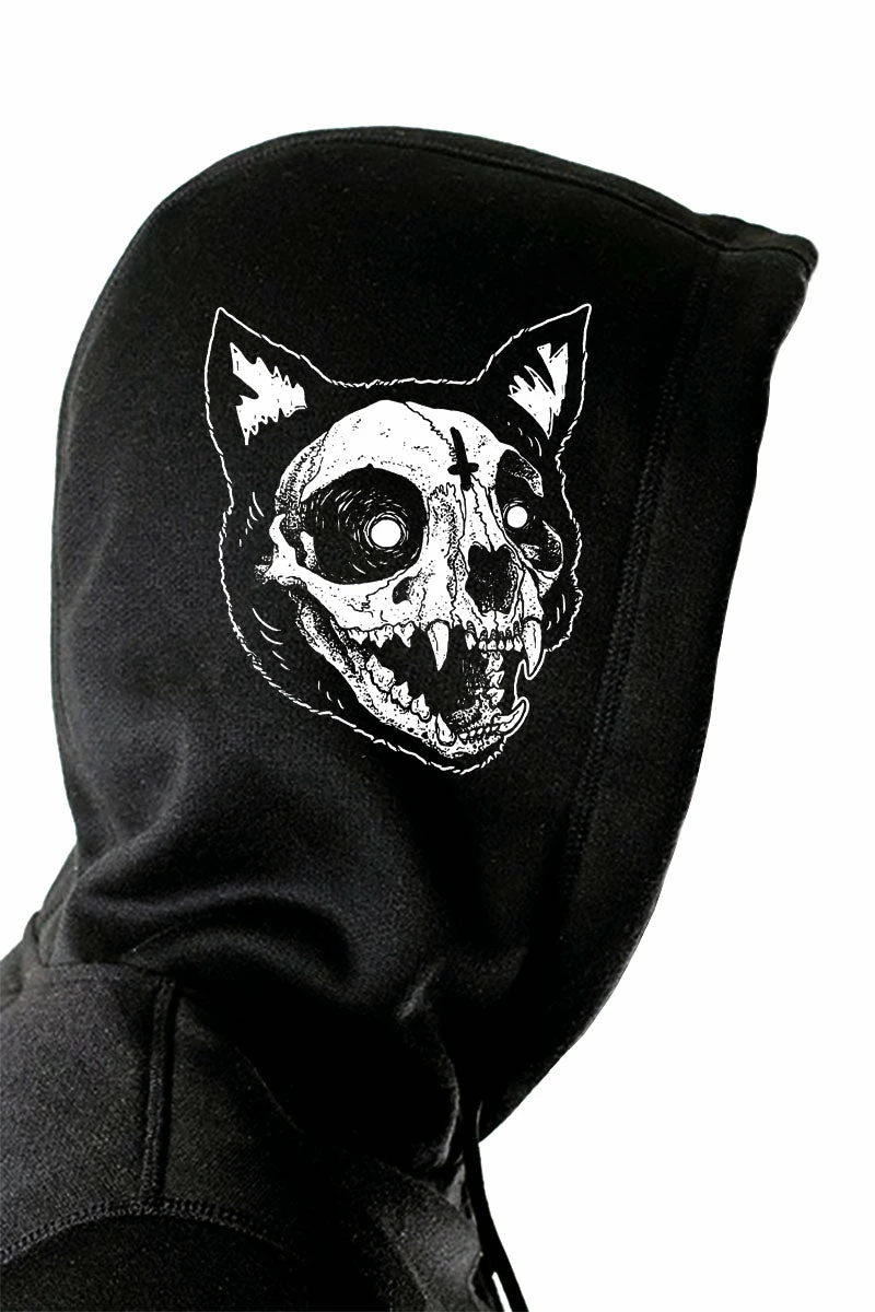 Conjure purranormal activity in this spooky spirit board hoodie! Features a mystical ouija board possessed with cat skulls, webs, moths, bats, pentagrams, and more! Summon scares with the occult symbols down the sleeves, and cat skulls on both sides of the hood! Constructed of quality cotton to keep you comfy + creepy.Â