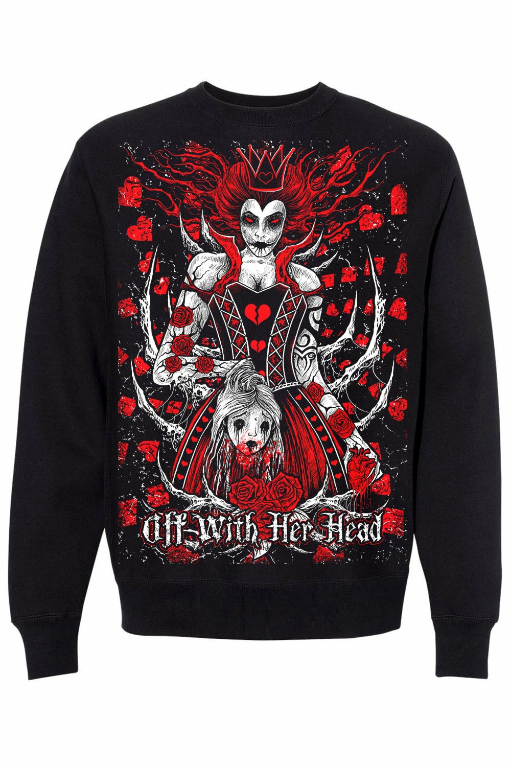 Fall down the rabbit hole, but don’t lose your head. This gory, gothic sweatshirt features the Queen of Hearts holding Alice’s decapitated head in one hand, and her still-beating heart in the other. With hair that twists into gnarled tree branches, blood-red eyes, and card suits all around, the Queen of Hearts has at last claimed her revenge on Alice in Wonderland.Â