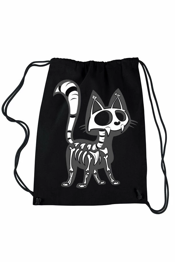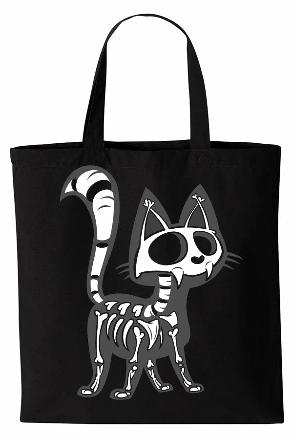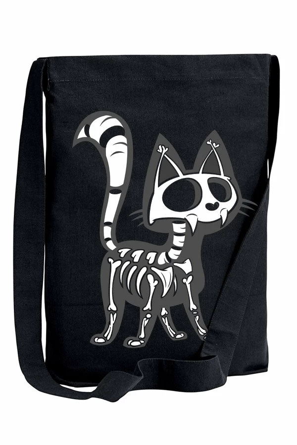 Conjure some cat power with this bundle of bones on your bag! With big empty eyes, fiendish fangs, and bones all about, this creepy cat is dyying to add some spook to yer look. Cart all yer essentials in this goth cat bag when you leave the crypt. No bones about it, yer pawsitively purrfect with the Skelekitty Bag by yer side!