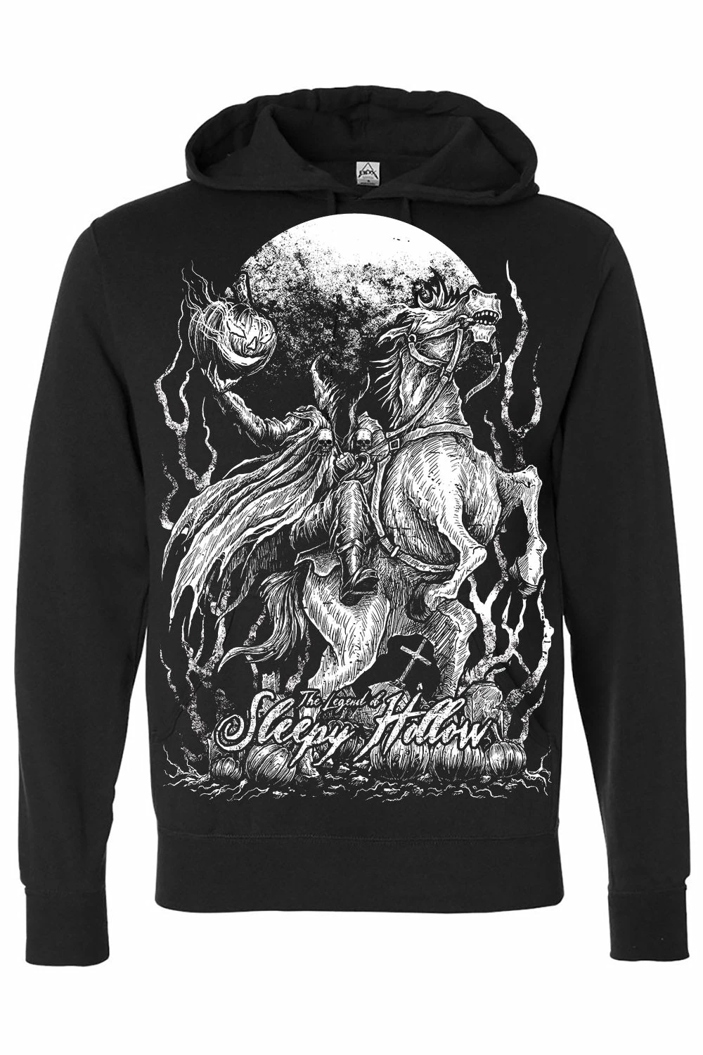 Ride into the dead of night in this chilling fantasy hoodie! Treat every day like Halloween in the heavy metal design, featuring the Headless Horseman riding his infernal horse and hoisting his disembodied pumpkin head. The words The Legend of Sleepy Hollow haunt the cemetery of jack-o-lanterns in fiendish font below, paying homage to Tim Burton’s horror movie masterpiece.