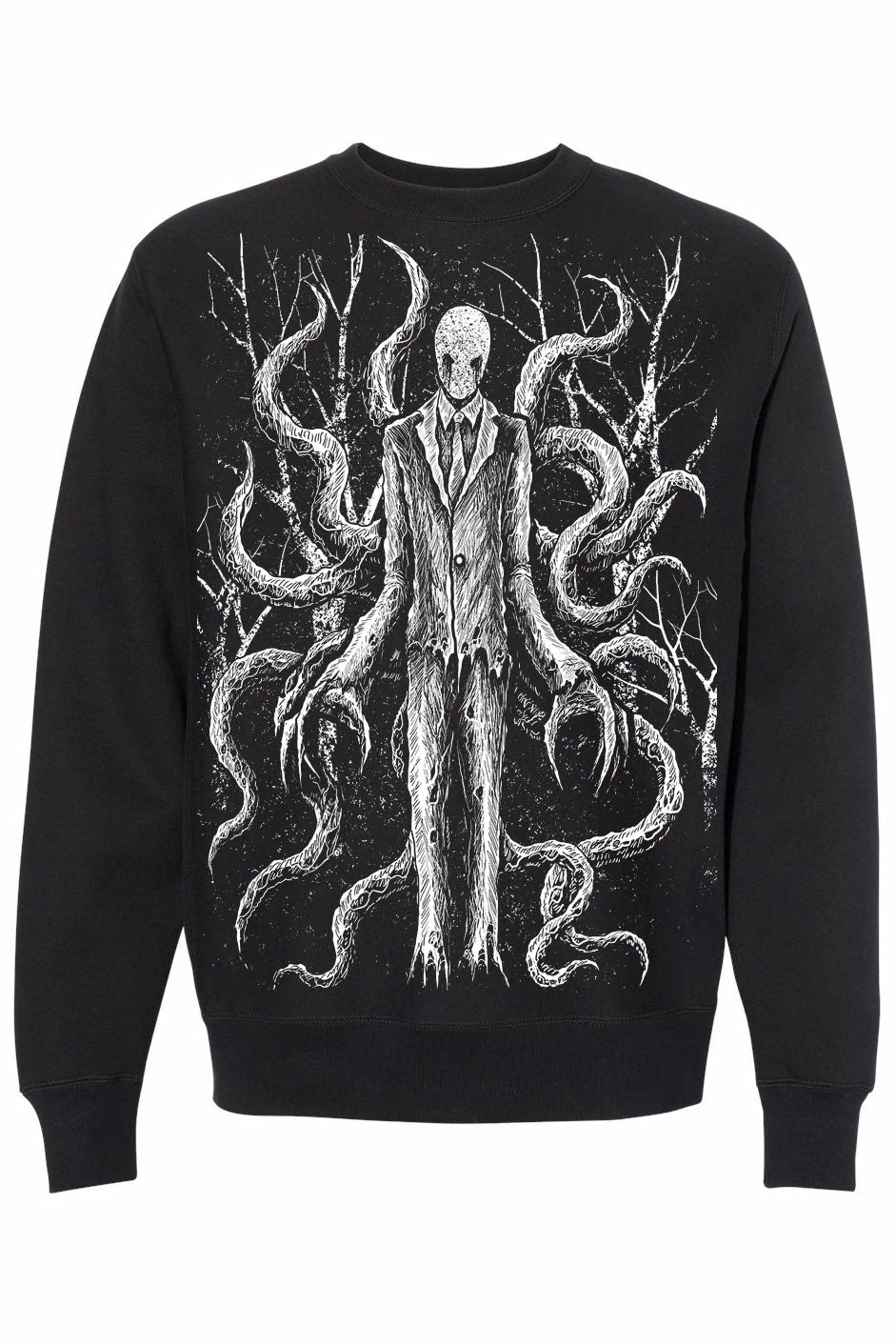 Summon the supernatural with this hella haunting design, inspired by Slenderman! Faceless but for empty evil eyes, the monster’s spindly figure looms in a forest with tentacles bursting from his ghostly-white body. There he awaits to stricken you with the paranoia of… the Slender Sickness.