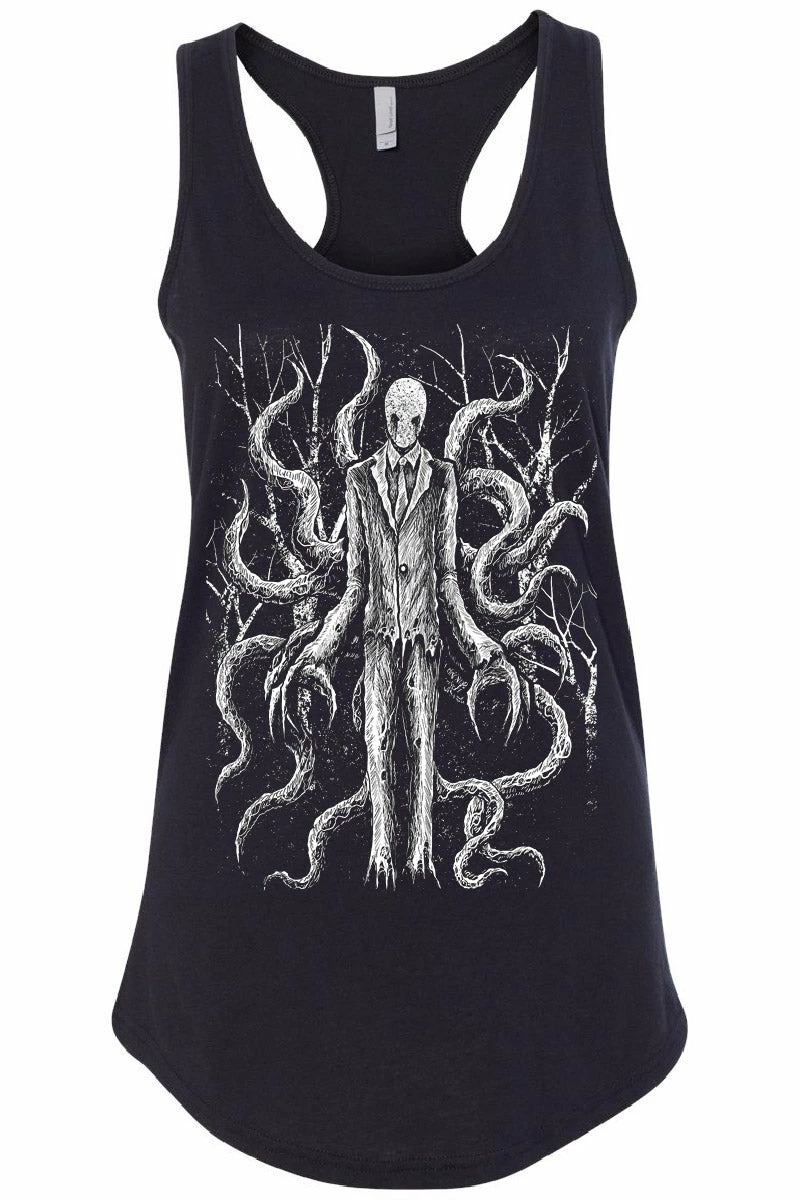 Summon the supernatural with this hella haunting design, inspired by Slenderman! Faceless but for empty evil eyes, the monster’s spindly figure looms in a forest with tentacles bursting from his ghostly-white body. There he awaits to stricken you with the paranoia of… the Slender Sickness. Â
