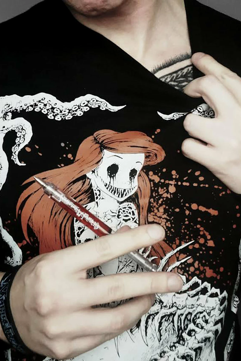 Drown in this gory tee, inspired by The Little Mermaid! Invoke creatures of the deep in the hella hardcore design, made under the sea for those who like their Disney dark AF! Tattooed with a bone tail, Ariel sits on a sunken skull in a tentacle frame. Conjure some seasickness with her empty demon eyes and razor-shark jaws. Ursula’s tentacles on the lone sleeve tee for villain vibez!