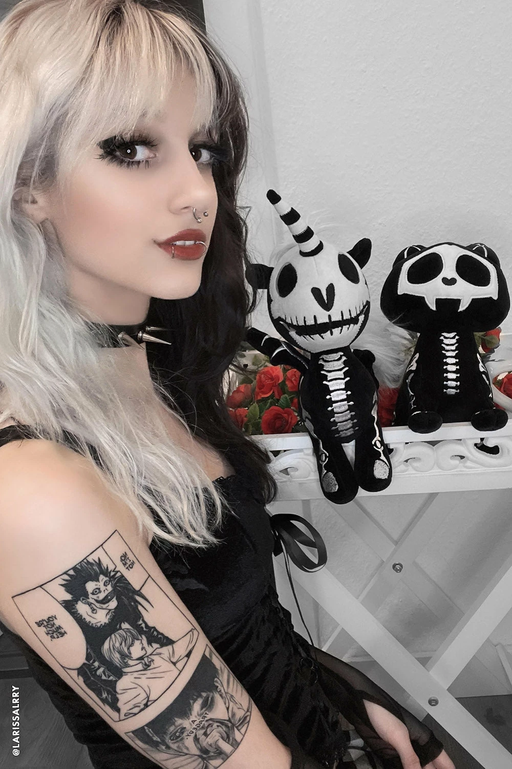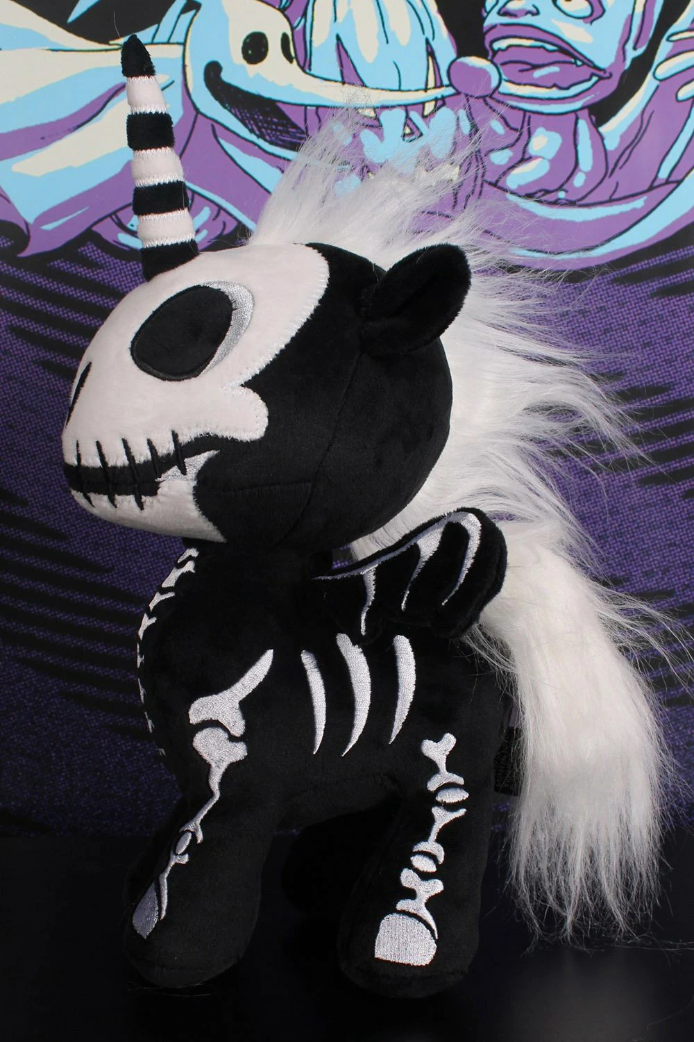 Make any room magical as an emo rainbow with this skeleton unicorn! Made of soft huggable plush, this creepy cutie features a dead unicorn complete with bat wings, bony body, fiendish fangs, striped horn, and ghostly-white mane. Play with her posable wings—stand her up on her haunted hooves! Adopt Unibones and she will love you with her whole, unbeating unicorn heart.Â