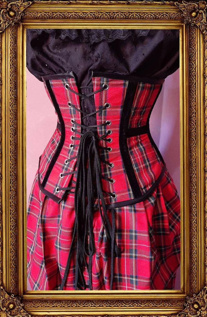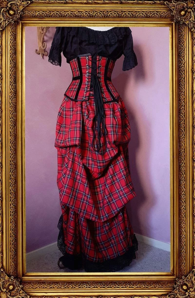 - This fun two piece set combines our best ever Victorian Bustle Skirt design and a matching ‘Pandora’ red tartan under bust corset.