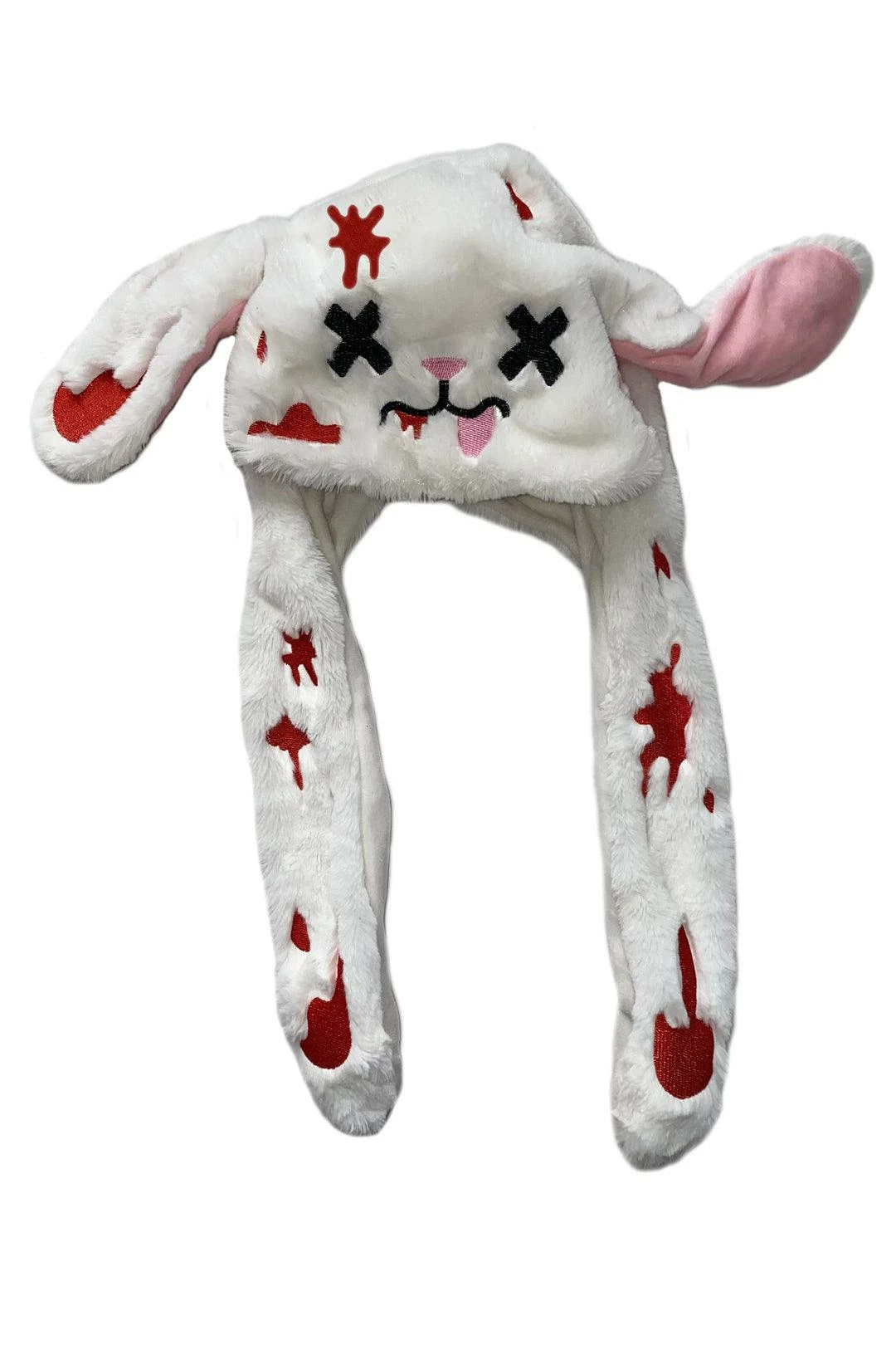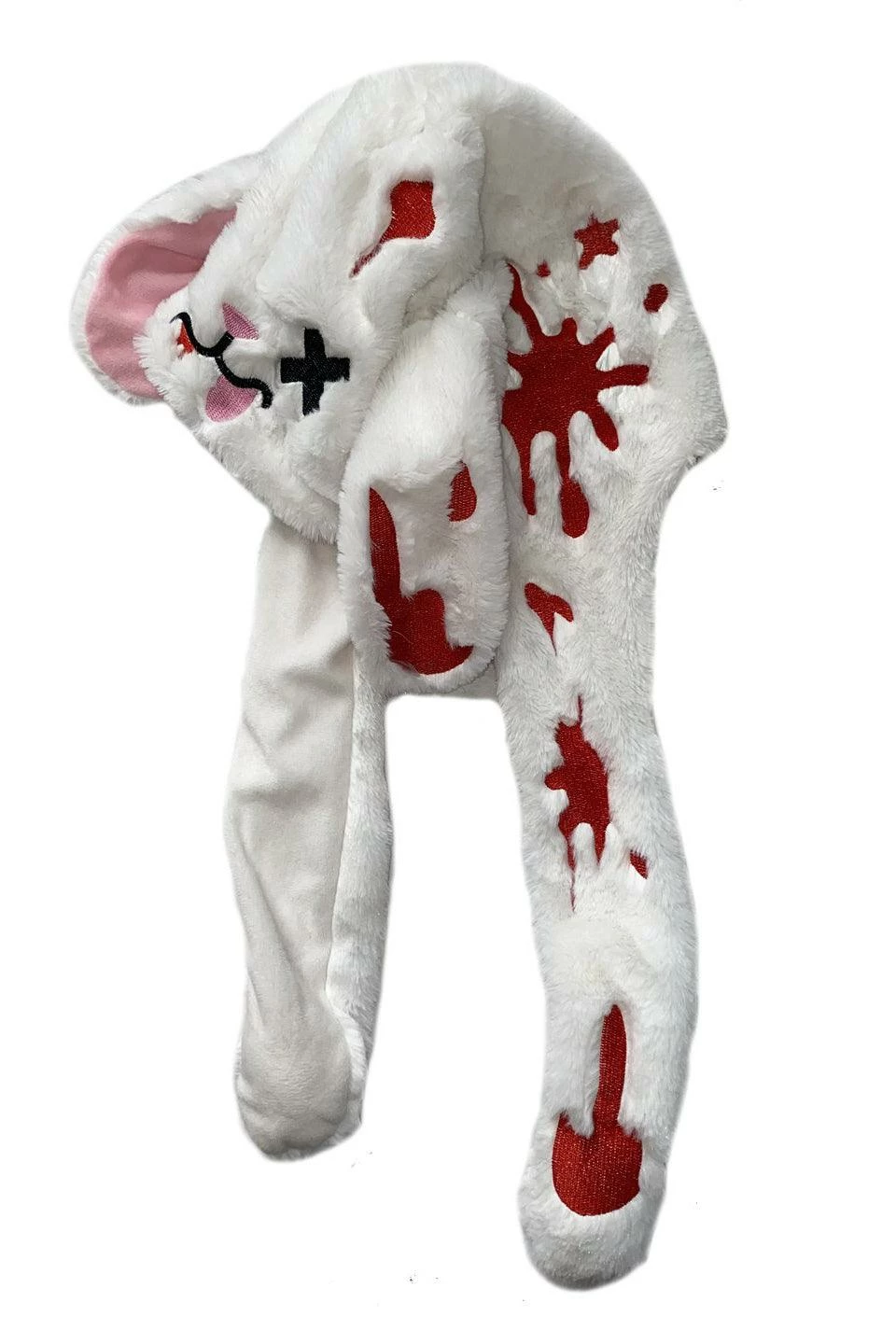 Be the cutest ball of roadkill they’ve ever seen in this bloody bunny hat! Summon scares wherever you go with the embroidered blood splatters all over and x-ed out dead eyes. Snuggle up in the super soft plush, complete with posable ears that move when you squeeze the hanging paws!